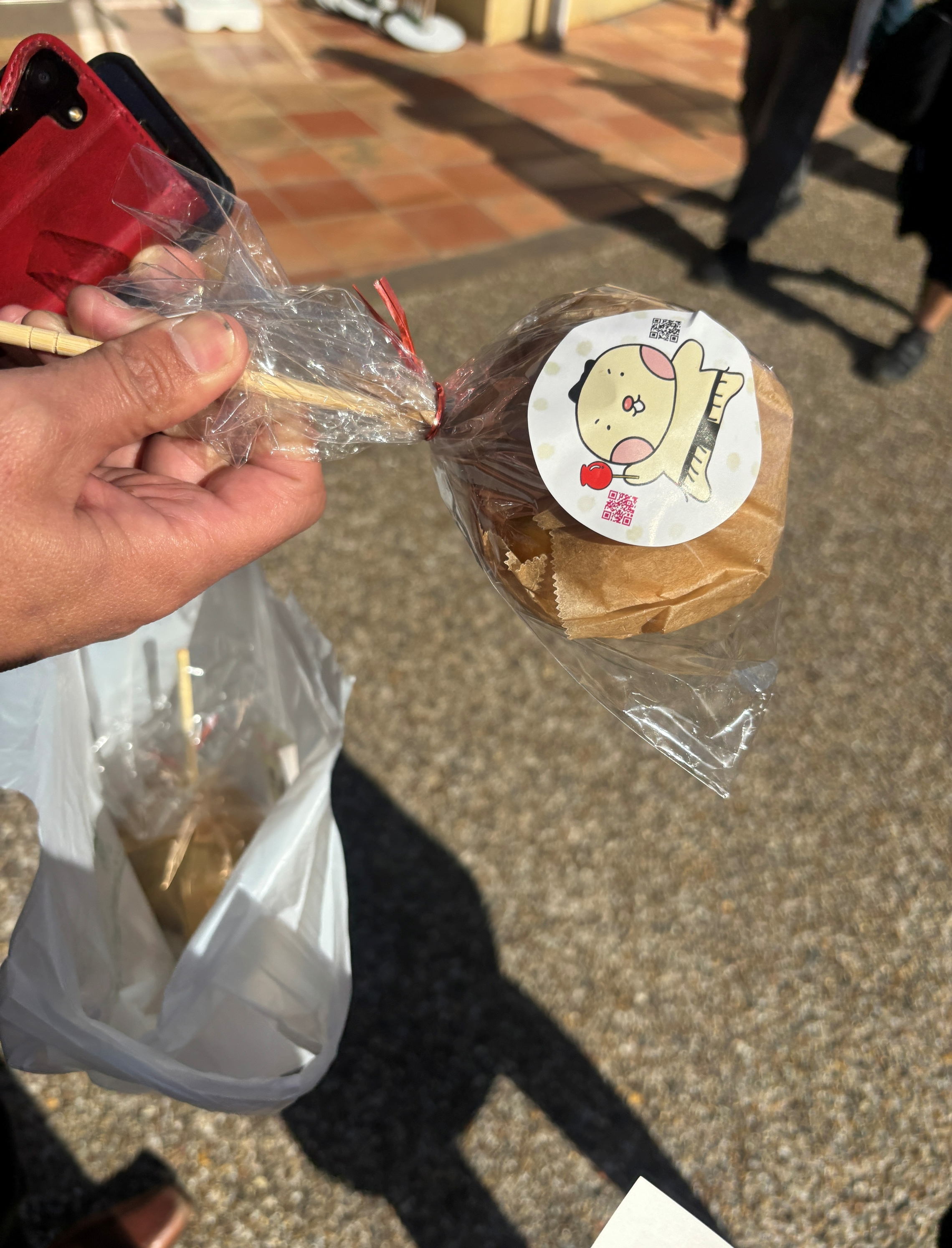 前回ぷらりん歩に参加したサービスマネージャーはりんご飴を買って大喜び(^_-)-☆