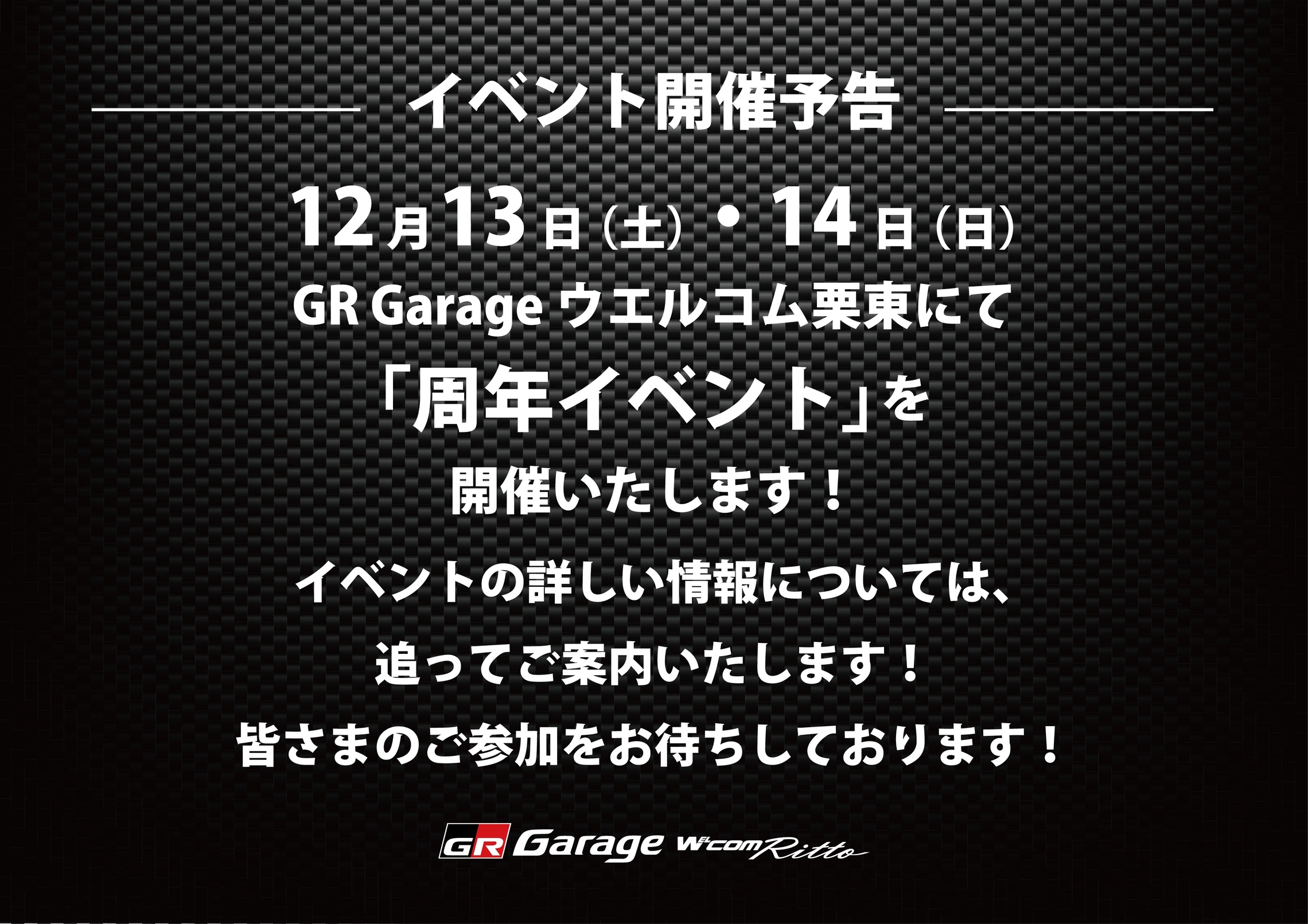 【 イベント開催予告!】 2025.11.03 皆様こんにちは! GR Garage ウエルコム栗東です! イベント開催のご案内です! 12月13日(土)・14日(日) GR Garage ウエルコム栗東にて「周年イベント」を開催いたします! イベントの詳しい情報については、追ってご案内いたします! 皆さまのご参加をお待ちしております! 前の記事へ 店舗ブログ一覧に戻る 次の記事へ