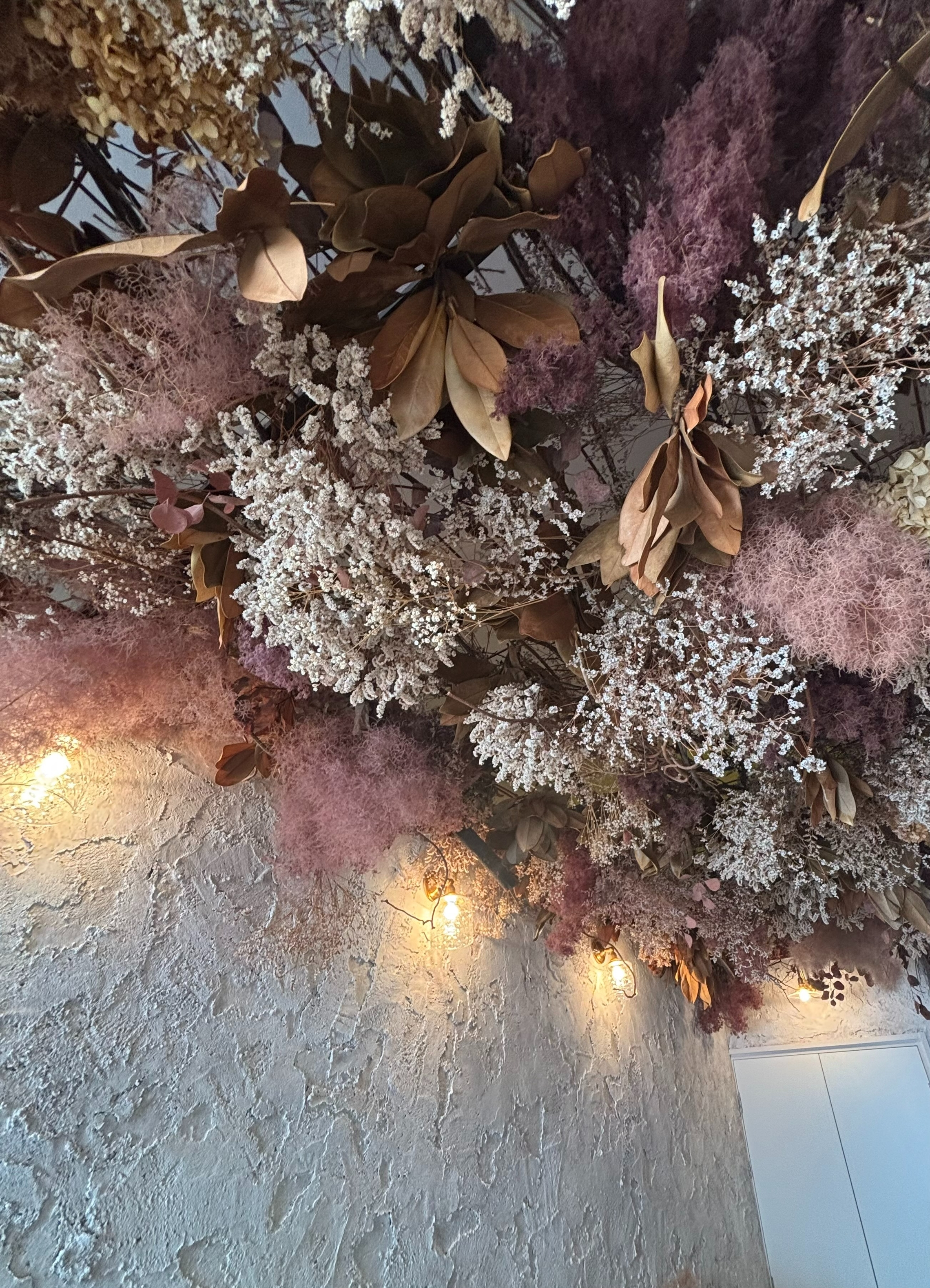 イタリアン料理店の建物内にお店があり、店内はたくさんのドライフラワーで装飾されています