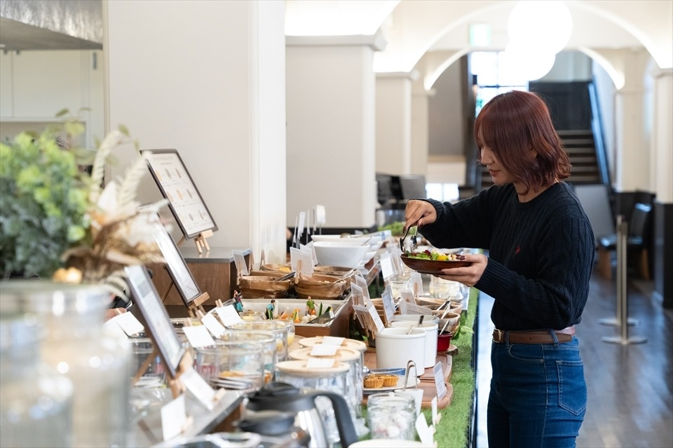 二階のレストランでは約50種類のお料理がそろうベジタブルビュッフェを楽しめます