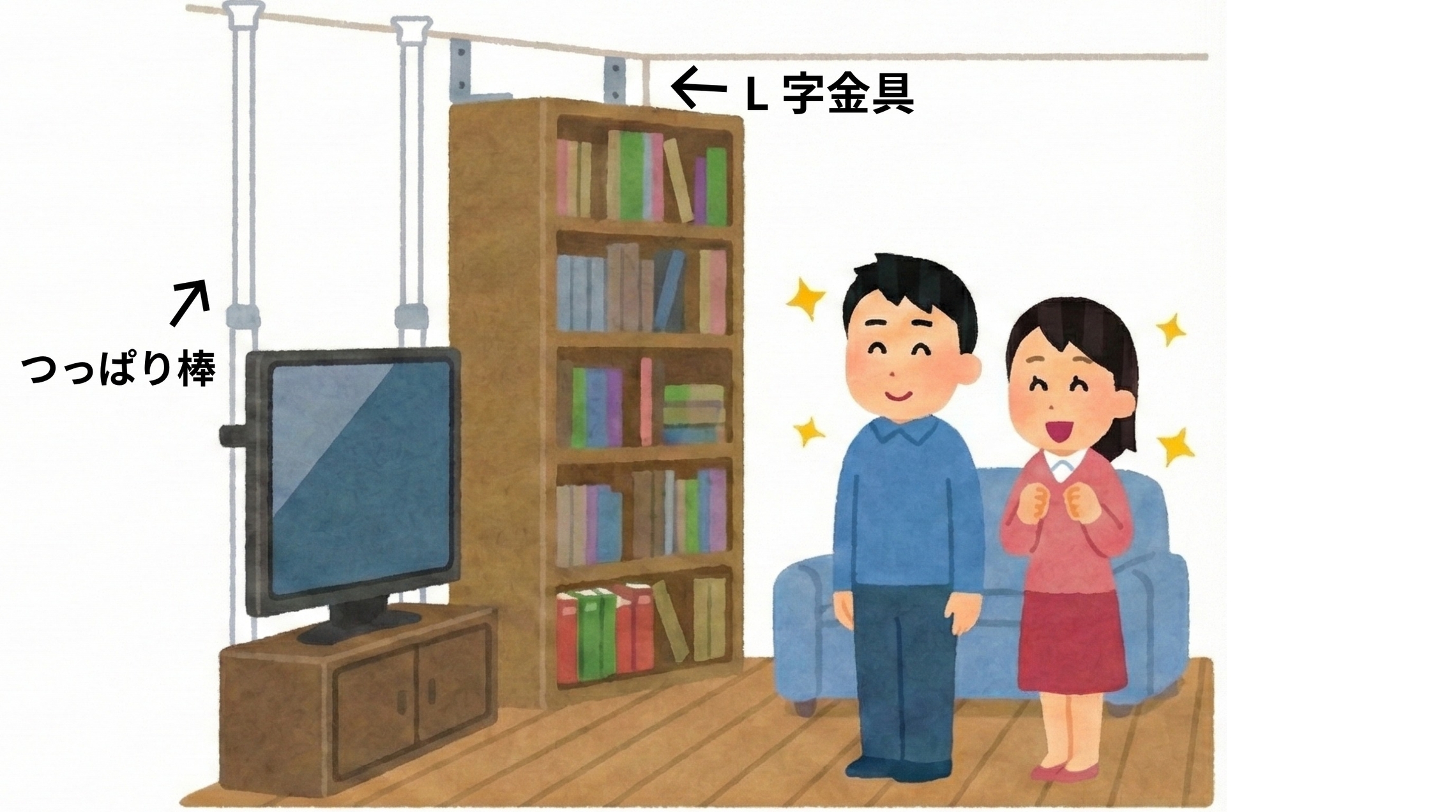 L字金具やつっぱり棒などを使い、壁や天井にしっかり固定して転倒するリスクを減らしていきましょう‼