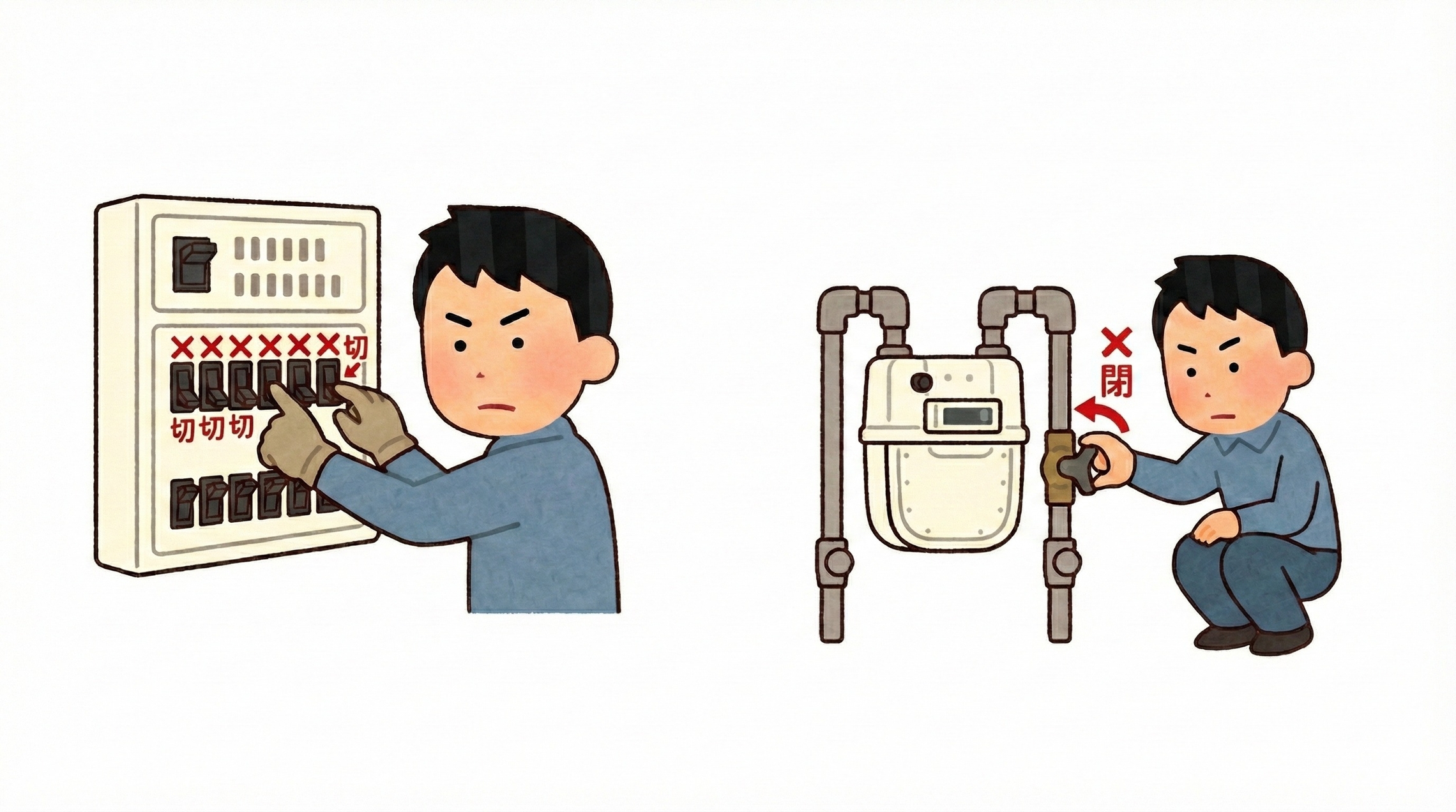 ・ガスの元栓を閉め、ブレーカーをすべてを落とす