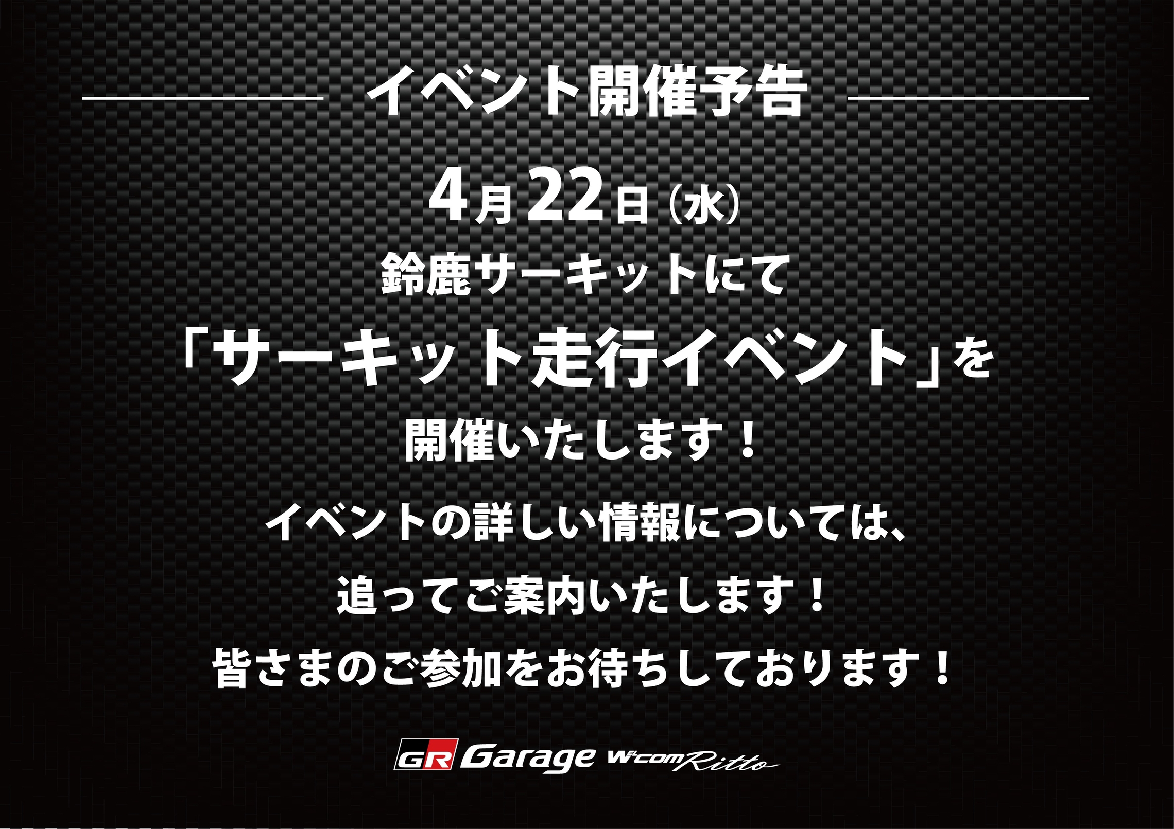 【 イベント開催予告!】 2026.02.09 皆様こんにちは! GR Garage ウエルコム栗東です! 4月22日(水)、鈴鹿サーキットにて 「サーキット走行イベント」を開催いたします! イベントの詳しい情報については、追ってご案内いたします! 皆さまのご参加をお待ちしております! 前の記事へ 店舗ブログ一覧に戻る 次の記事へ