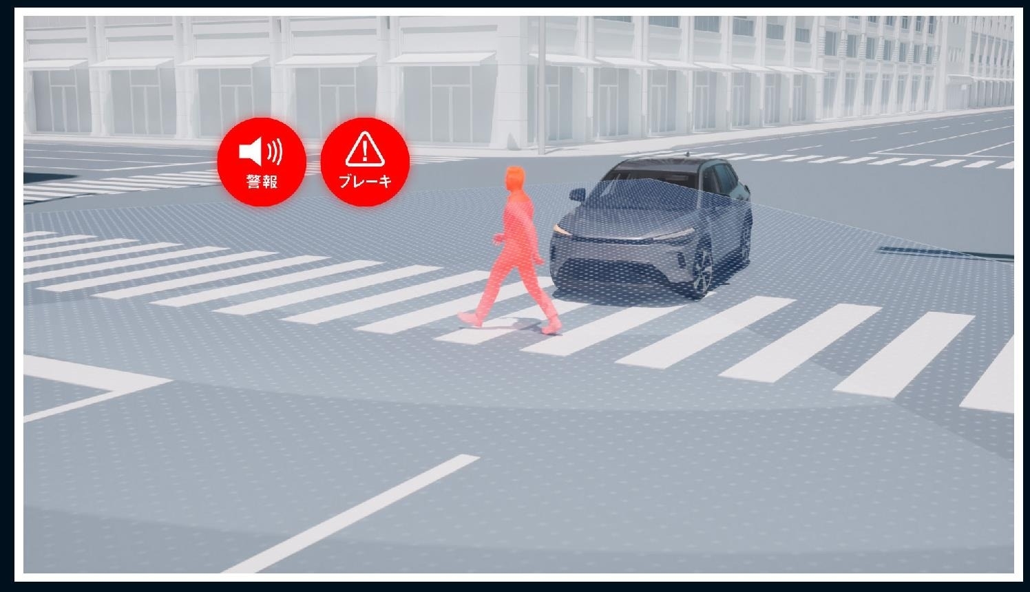 *2026年2月現在。「旋回中の低速時加速抑制」、「交差点進入時、車陰からの飛び出し検知」、「先行車減速の早期検知」がトヨタ初。■自転車および自動二輪車は、人が乗車している状態が対象です。■写真は作動イメージです。■写真のカメラ・レーダーの検知範囲はイメージです。■写真は機能説明のために各ランプを点灯したものです。実際の走行状態を示すものではありません。