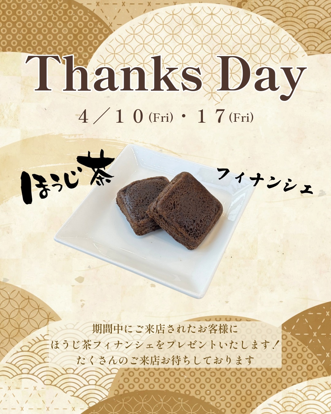 Thanksdayのご案内🎀 2026.04.05 皆さまこんにちは! トヨタモビリティ滋賀唐崎店でございます\^o^/ 『 Thanks day 』のご案内です🎀 今月は10日(金)・17日(金)です(≧∇≦)ノ ご来店いただいたお客様に、 ほうじ茶フィナンシェをプレゼント🎁 ぜひご賞味ください! 車検や点検などの予約もこの日に合わせてみてくださいね~~~ ↓限定ドリンクのご案内はこちら 前の記事へ 店舗ブログ一覧に戻る 次の記事へ