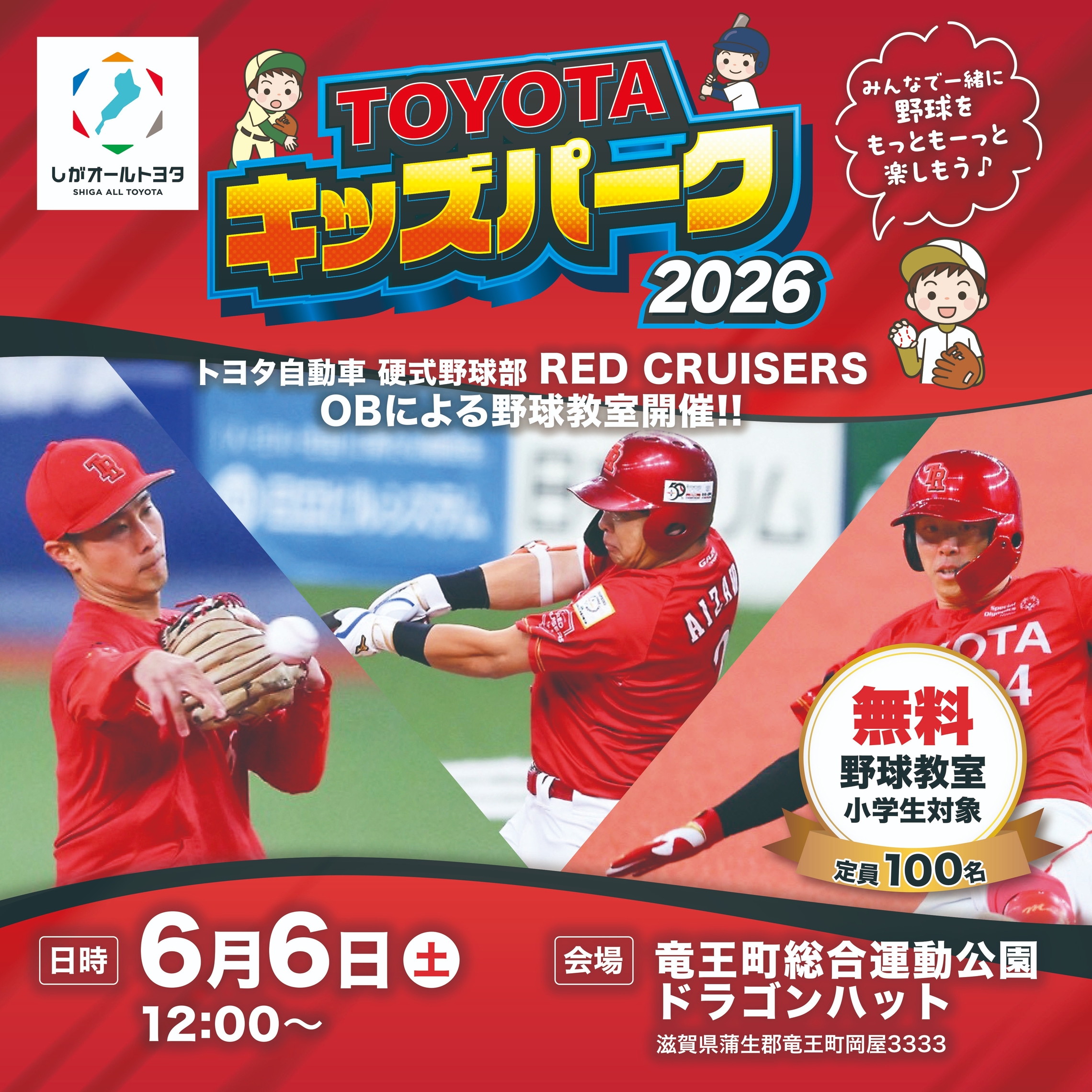 野球教室開催~TOYOTAキッズパーク2026~ 2026.04.17 みなさんこんにちは! トヨタモビリティ滋賀 小野店 フロントスタッフです(`・ω・´)ゞ 滋賀県内の少年野球チームに所属する 小学生のみなさんに朗報です!!!!! 2026年6月6日(土)12:00~ 竜王町総合運動公園 ドラゴンハットにて 社会人野球の強豪チーム、 トヨタ自動車 硬式野球部 RED CRUISERSのOBによる 野球教室が開催されます٩( ''ω'' )و 参加方法や詳細は画像をクリックしてご確認ください。 ↓↓ ご参加をお待ちしております(^^)/ 前の記事へ 店舗ブログ一覧に戻る 次の記事へ