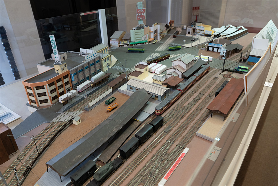 昭和40年代の浜大津を再現したジオラマ。京阪電車、江若鉄道、国鉄が行き交う一大ターミナルでした