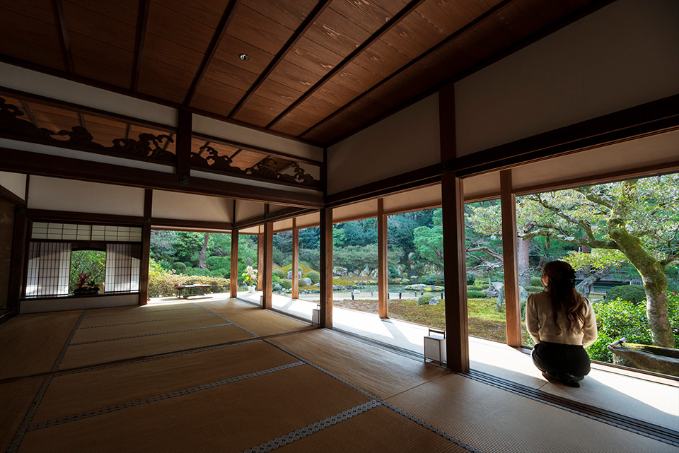 座敷からの庭園の眺めは、思わず息をのむ美しさ