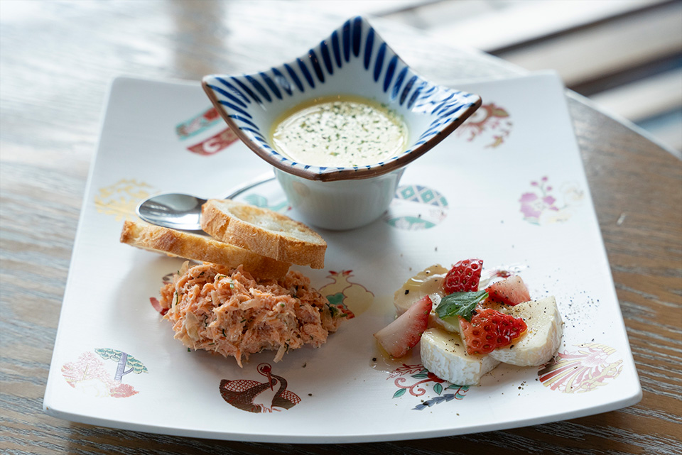 前菜は「サーモンのタルタル」「イチゴとカマンベールチーズのカプレーゼ」「コーンスープ」