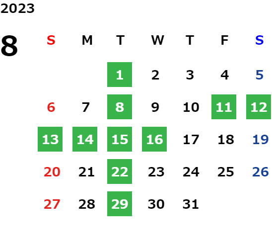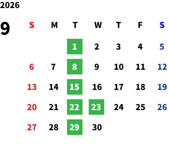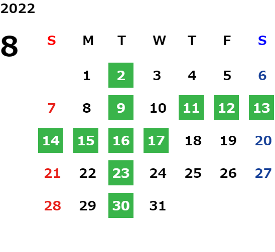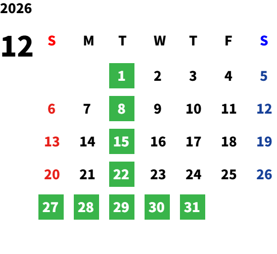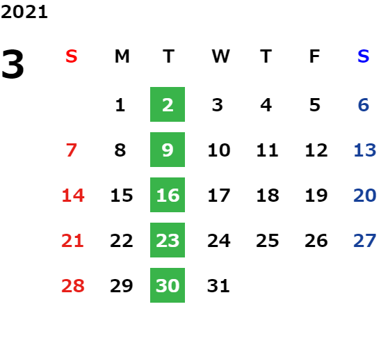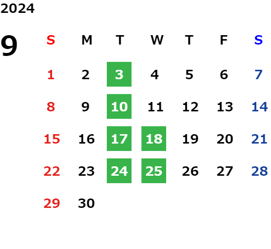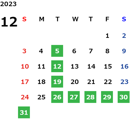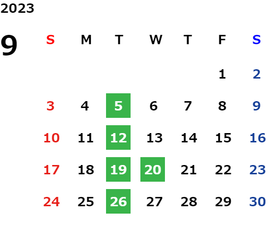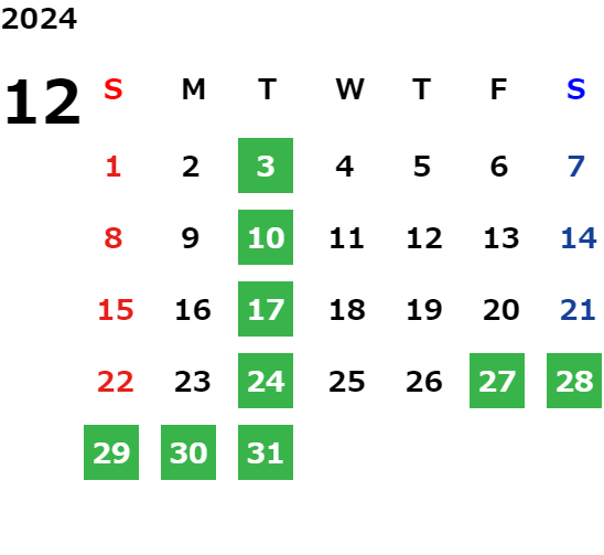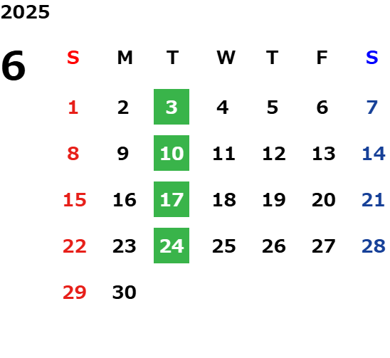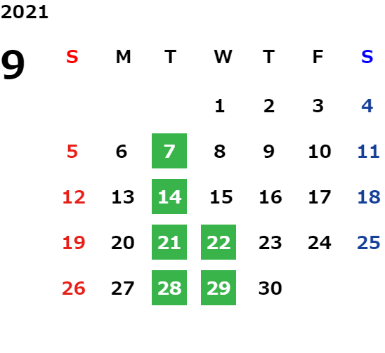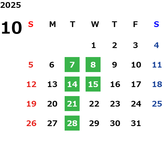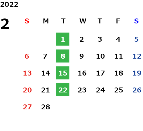 毎週火曜日(詳しくは営業カレンダーをご確認ください)